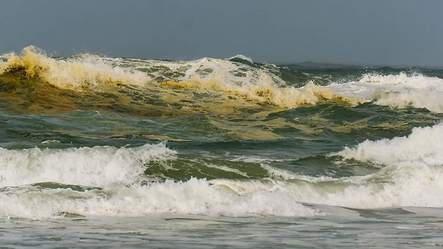 ריח צחנה וצבע צהוב שממש לא מזמינים שחייה או גלישה. חוף פלמחים סגור בגלל ביוב בעונת הקיץ הקרובה. צילום: משה קוסטי